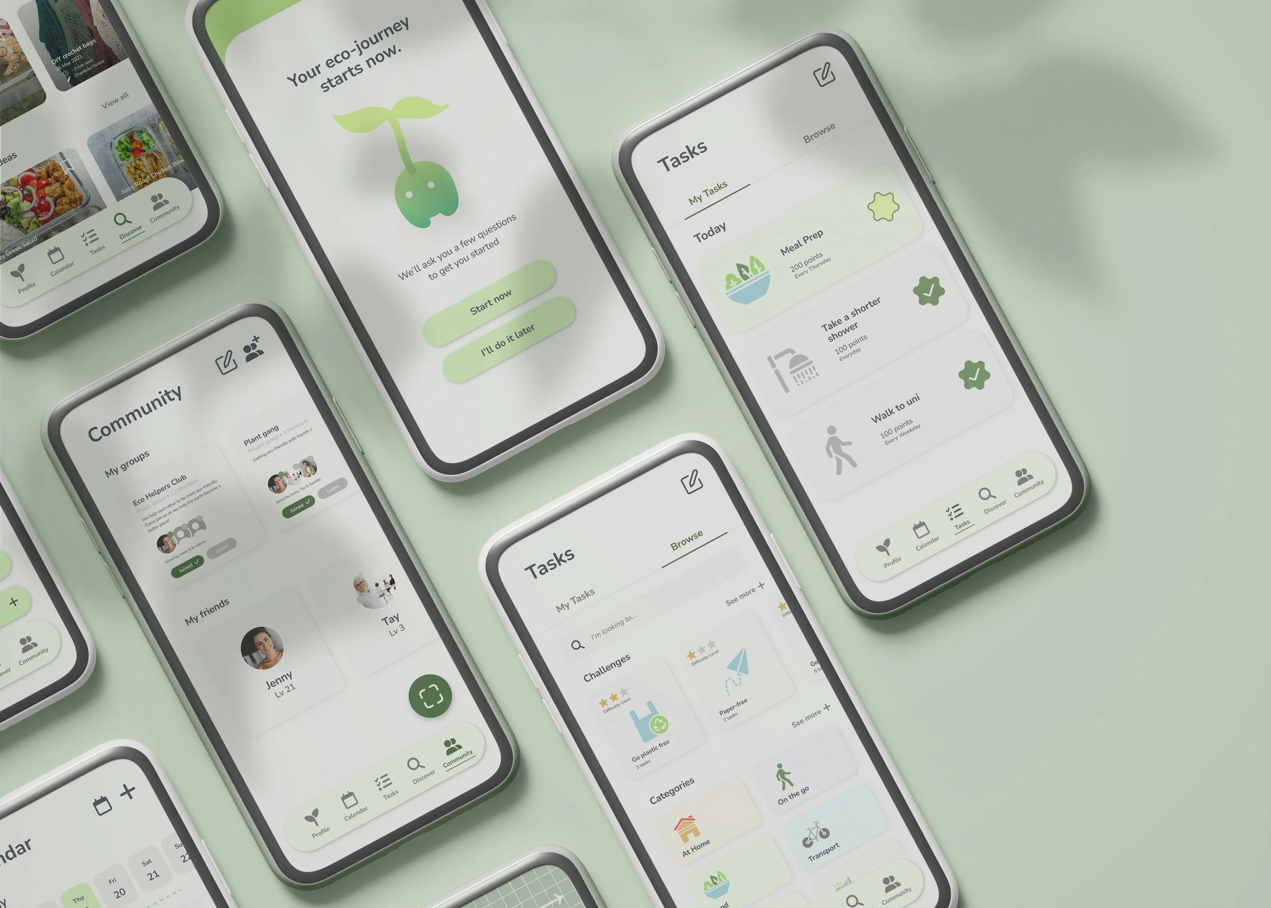 To solve this issue, I’ve designed an immersive eco-habit tracker app, that helps users to make more sustainable choices, reduce their carbon footprint and organise their schedule, in a way that aligns with their personal sustainable living goals. In doing so, I have gone through an extensive research and user testing process.